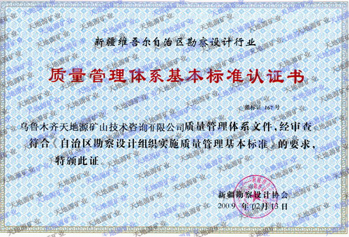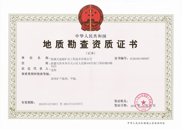新疆天地源地勘公司成立于2004年,歷經(jīng)十余年的發(fā)展,現(xiàn)持有地質(zhì)勘查甲級(jí)資質(zhì)和ISO9001:2008質(zhì)量管理體系認(rèn)證證書。